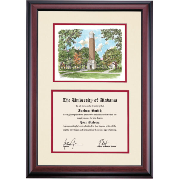 Celebrate your graduation in style with this handcrafted premier diploma frame which includes a Professional Print of Denny Chimes. Custom crafted to fit your University of Alabama diploma, this frame features accent matting and high quality hardwood moulding.
